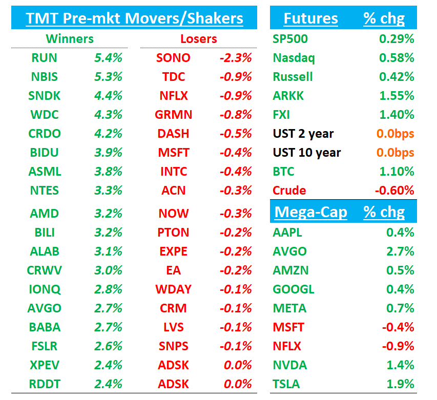 Futures +60bps as the AI trade continues in full force early. Memory names leading the way up early again (WDC +4%, SNDK +4%, STX +3%; ASML +4%). NVDA +1.4% to more ATHs while AMD +3% playing catch up as chart looking a lot better. Asian semis ripped with Hynix +10% and Samsung +4%, helped by the news OAI needs 900k wafers per month. HSTECH +3% as BABA +3% continues to hit new highs. BTC +1%. Yields flattish.