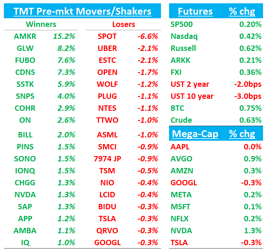 Good morning. QQQ +43bps as AI semis leading the way higher again with NVDA/AMD +1% helped by some positive news flow (EU buying $50B of chips + TSMC ramping chips for China) along with some good beat-and-raise prints and positive AI commentary from CLS, AMKR, GLW, and Advantest. The Hot AI Summer continues…