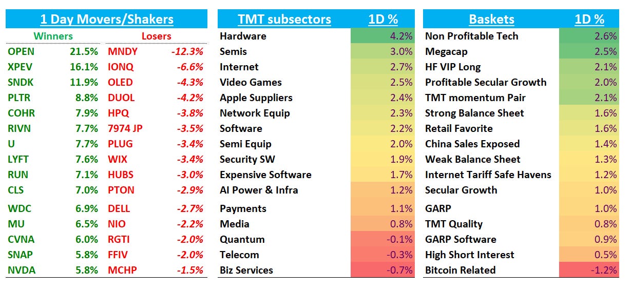 NVDA+6% as TSM +3% monthly results slightly better than expected, Jensen asking TSM for more wafers (‘very strong demand .. growing month by month, stronger and stronger’), MS saying Q4 racks 14-15k, and several positive previews across the street today ahead of earnings next week
