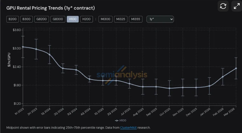 GPUs: Semianalysis positive on Rental Pricing saying “On-Demand GPU rental capacity is sold out across all GPU types – those that have locked up on-demand instances are not willing to relinquish this capacity back into the pool despite recent price hikes.”