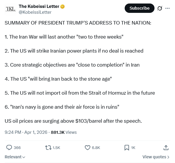 Good morning. Futures -2% and began their descent during Trump’s speech last night. Oil +10%. We framed it as: the speech didn’t have much new, which means it was negative “rate of change” (can you tell we trade tech stocks?). The direction of travel — at least from a perception standpoint — was de-escalatory all week, but this speech wasn’t that at all and opened up more questions than existed about path going forward while at the same time Trump failed to “pump the market.” No mention of boots on the ground (is that a typical Trump non-denial which = might happen?). We got the 5-7% rally this week on the perception of a walk away happening increasing. Now that’s over and going into a long weekend, investors rather not be grossed up on a situation that skews negative. Back to playing defense. Great thread here in TMTB Slack last night which was extremely helpful real-time in framing and reading the tea leaves of the speech, especially in a situation like this which continues to be extremely fluid. Thanks to all those who continue to share their views.