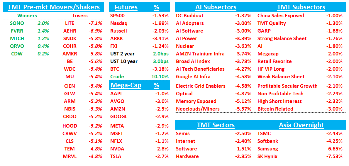 Early action is opposite of yesterdays with leading AI names leading the way lower: LITE -&%, SNDK -6%; MU -5%. Large cap internet also off with AMZN -3%; GOOGL -3%; META -3%