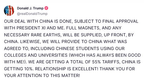 10% universal + 20% fentanyl + Section 301 tariffs = 55% tariff rate on US imports from China - I believe that’s where that 55% # is coming from…