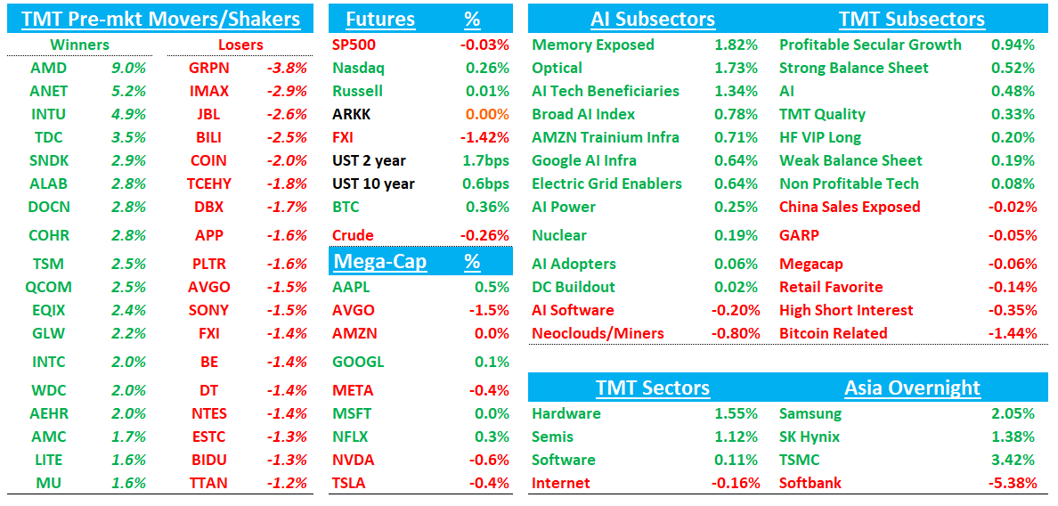 Good morning. Futures +30bps as all eyes still on NVDA tomorrow. Big META/AMD +10% deal today. Asia mixed with China down but Korea up: TPX +0.2%, NKY +0.87%, Hang Seng -1.82%, HSCEI -2.06%, SHCOMP +0.87%, Shenzhen +1.23%, Taiwan TAIEX +2.75%, Korea KOSPI +2.11%. Softbank -5%. TSMC +3%. BTC -2%