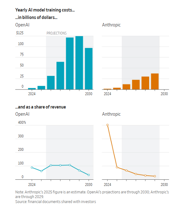 According to WSJ, OpenAI and Anthropic are preparing for record-breaking IPOs by year-end while facing massive profitability challenges driven by soaring AI model training costs. OpenAI projects spending $121 billion on computing power in 2028 with $85 billion in losses that year despite nearly doubling sales, while both companies show mounting training expenses that dwarf historical precedent. Both firms expect significant negative free cash flow through 2030 and are relying on IPO proceeds to fund their operations, with bankers seeking rule changes from index providers to accommodate their capital needs.