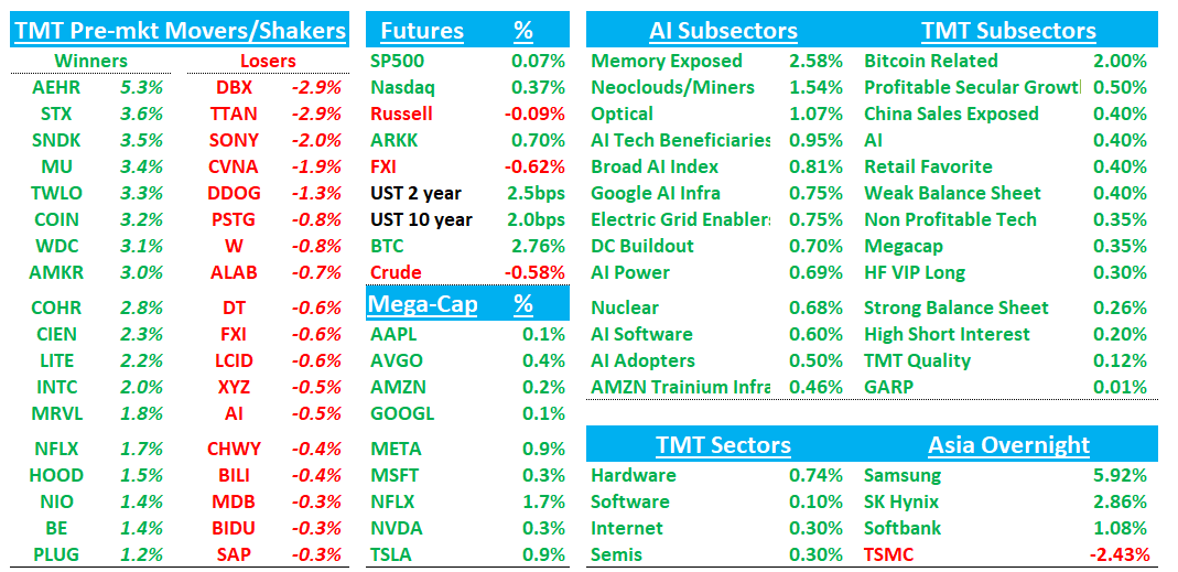 Favored AI semi sectors leading the way up early with Memory/HDDs +3% on a slew of Asia/sell-side datapts and Optical +3-5% helped by AAOI announcing more orders. Memory names were strong overnight as well with Samsung +6% and Hynix +3%.