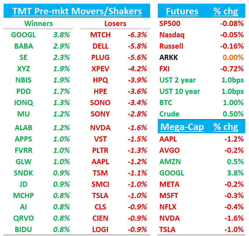 Good morning. Futures -15bps to start the week as all eyes in Tech this week on Gemini 3 release and NVDA earnings on Wednesday. In case you missed it, we wrote about the AI non-bubble and Sam’s Splurge over the weekend.