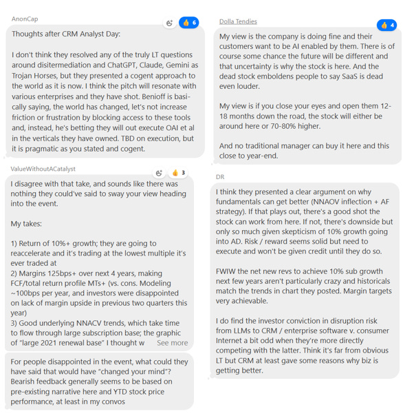 Sentiment was horrible heading in, so not surprising to see stock rally. Most feedback I had in conversations were similar to the above in the chat, with most investors I talked to blase about the stock (why is 10% growth exciting when semis and infra sw accelerating?) and some pushing back that its still a show me story as pushing out 12-18 months to get to double digits won’t last without execution. Yet most acknowledge sentiment horrible and valuation cheap so they execute on their plan and see further Agentforce traction, stock can work