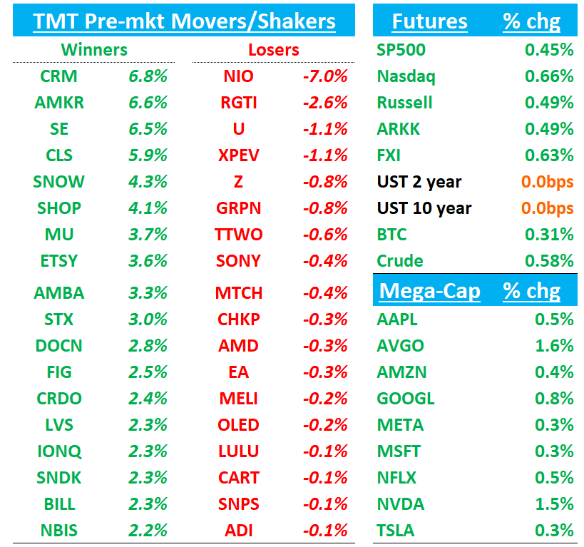 CRM +6%: Solid analyst day with 10% CAGR over next 4 years and 40% margin target (up from 34%). Strong commentary around AI traction, and a “50 by FY30” yardstick