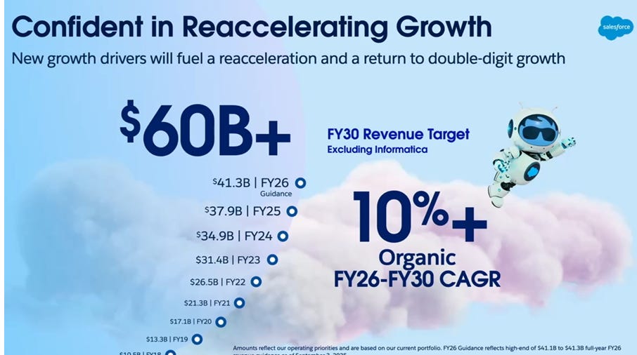 Salesforce set FY30 revenue of $60B+ (ex-Informatica), implying 10%+ organic CAGR FY26–FY30, and introduced a “50 by FY30” framework (subscription & support CC growth + non-GAAP OpM = 50), which implies ~40% OpM by FY30 vs ~34% in FY26 guidance.