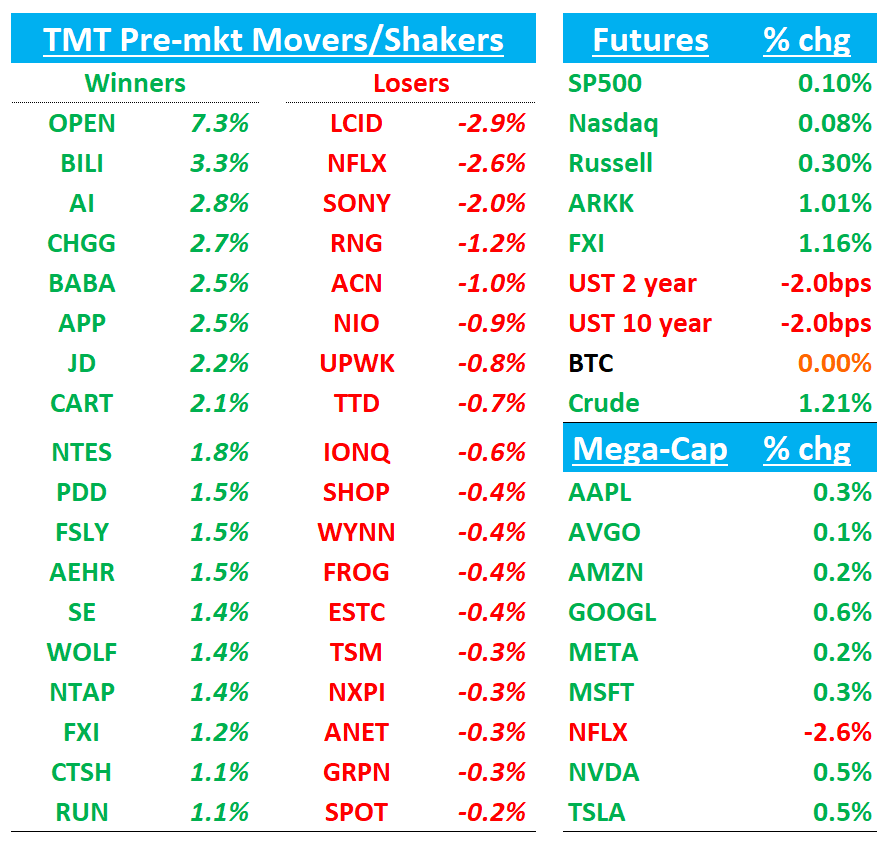 Good morning. QQQs +4bps on a slow Friday summer morning. NFLX results were ok, unlikely to change the narrative. The macro front is quiet with no major developments since the Thursday close other than Fed’s Waller speech post-close where he explicitly called for a 25bp cut at the upcoming July meeting. Fed expects still hover around 42bps worth of cuts for the rest of the year. Yields down 2bps to start the day. China +1%. BTC flat.