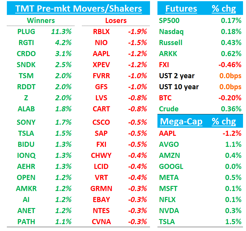 Good morning. Futures +15bps. Reminder, no jobs report today bc the gov’t shutdown. Main macro report is US services ISM at 10am. China -1%. BTC and yields flattish.