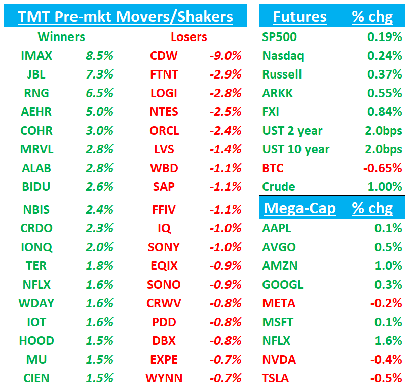 Good morning. Futures +30bps early this morning although selling off a bit following the ORCL headline below around funding talks with Blue Owl stalling re: their Michigan DC. Asia stocks mixed: : TPX -0.03%, NKY +0.26%, Hang Seng +0.92%, HSCEI +0.98%, SHCOMP +1.19%, Shenzhen +1.68%, Taiwan TAIEX -0.04%, Korea KOSPI +1.43%. But Memory names strong ahead of MU EPS tonight: KIOXIA+7%, PHISON+5%, SAMSUNG+4.5%, Hynix +4%, Nanya+4%.