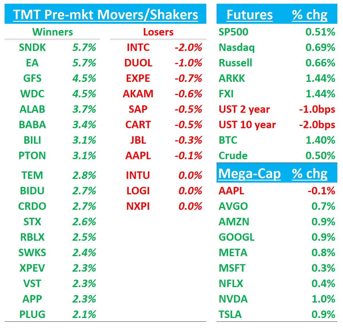 Good morning. Futures +65bps to start the week. China +1% strong overnight with Tech leading the way (HSTech +2%) and KWEB +2%+ in the pre. A relatively slow week on the Tech calendar with most focus on a busy week of macro data, with the main event Friday’s NFP report.