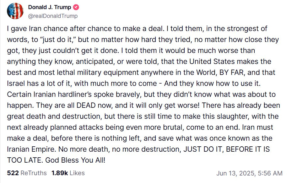 Good morning. QQQs - 1.1% although well off their lows after Israel began launching missiles at Israel, targeting missile and nuclear infrastructure along with senior military and nuclear officials. Crude is up 8%. Here’s what Trump said: