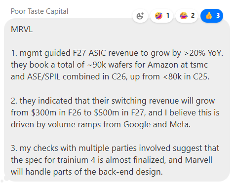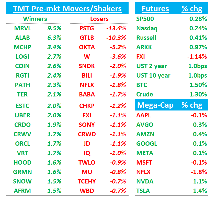 MRVL +8%: Clean quarter with a small beat, a modest top‑line guide up, and a big step‑up in multi‑year AI DC growth/margin ambition, helped by the Celestial AI deal. Skepticism around Mgmt targets still loud as many have PTSD from previous failed growth targets