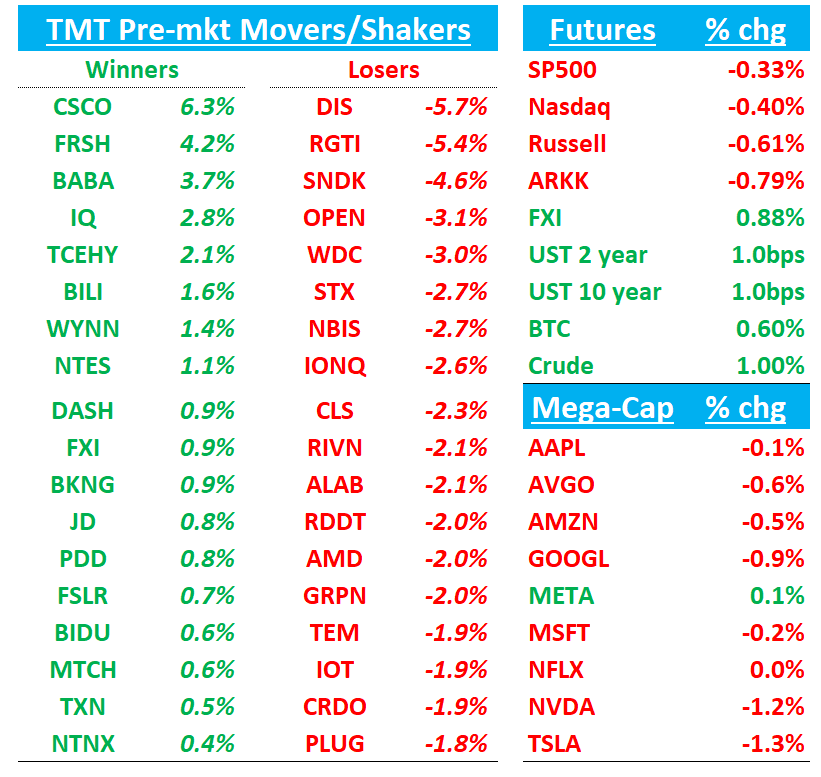 CSCO +6%: Cisco beat on revenue/EPS, raised both Q2 and FY26 guidance, and flagged sharply accelerating AI-networking orders, while security stayed soft on a mix shift to cloud.