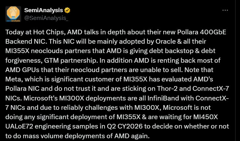 AMD: SemiAnalysis highlights Pollara NIC launch, MI355X challenges, and cloud partner dynamics