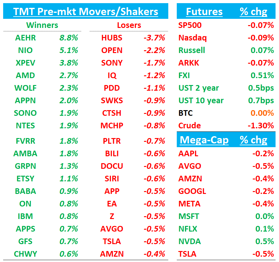 Other than that - fairly slow morning. BTC/Yields flattish. China +50bps. We get MDB and OKTA earnings tonight and then NVDA tomorrow night.