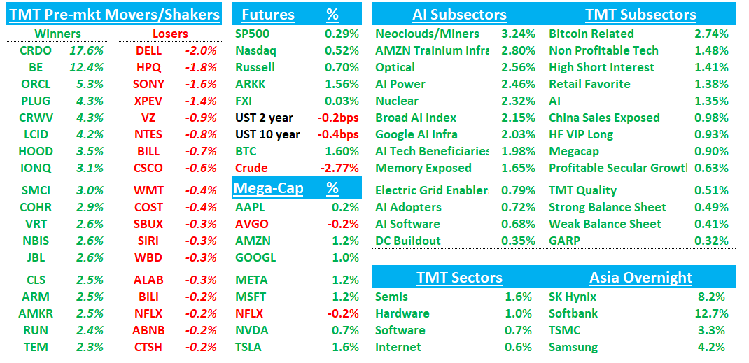 AI Vibes in full force this morning with BE +12% after expanding their partnership with ORCL and CRDO +18% after their Dustphotonics acquisition. Feels like the good ol’ days of last year’s HOT AI SUMMER — even ORCL is catching a bid these days!