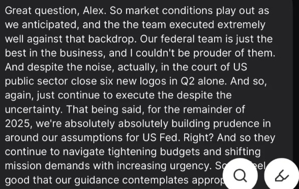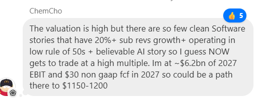Question is do investors believe the 19% sub revenue growth for next year is too low or too high. We don’t have a clear answer right now. Along with SAP, we think NOW is the app sw story with the best AI story, but both are facing headwinds from weaker federal. Bill and co. continue to execute very well and there’s a scarcity value here as mentioned above from being one of the cleanest app sw stories. We like it, but we don’t love it at 40x, and we continue to favor more heavily exposed infra/AI sw stocks.