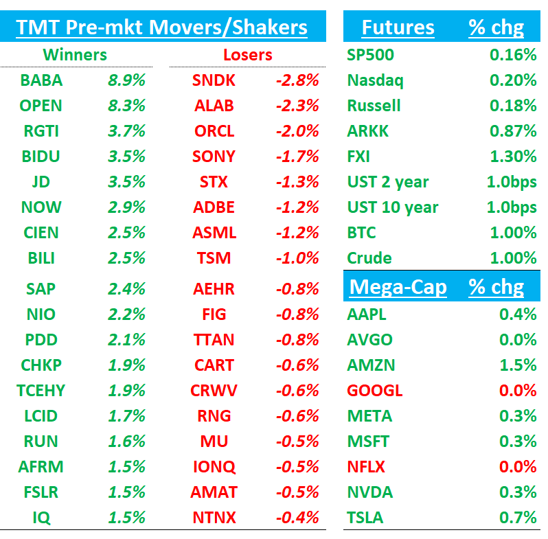 Good morning. Futures +20bps to start the morning. MU -1% trading down slightly on a set of strong numbers given high expectations and some concerns which remain around HBM, although the call sounded v bullish on demand. BABA +8% early after talking up capex and announcing partnership with NVDA around Robotics at their cloud conference More OpenAI compute spending news overnight and I’m getting the sense investors feeling a little bit of fatigue from all these announcements.