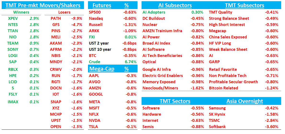 Good morning. Futures -60bps as more concerns around Oil +6% staying higher for longer as Brent nears $100 again. 2 tankers struck in Iraqi waters / Oman clearing ships from its key export terminal outside the Strait of Hormuz / Chinese refiners starting to cancel fuel export cargoes all driving Oil higher this morning. We’ll see how long Trump and team can last — NBC News quoted a WH source saying it only has until the end of March before oil becomes an “unsustainable political five-alarm fire”
