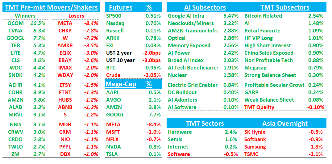 Good morning. Futures +70bps on the back of a set of solid prints from GOOGL and AMZN, a decent one from MSFT, and a so-so one from META. A lot of similarities among the 4 however with the obvious message that AI/compute is still the biggest priority and focus among all 4.