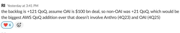 Call also had some pretty bullish points: 1) $225bn+ in rev commitments for Trainium. Mgmt said they see potential to sell Trainium racks externally “very much a possibility” over the next few years; 2) 1Q backlog $364bn (+49% q-q), and is exclusive the $100bn+ from Anthropic last week. Mgmt also called out accelerating customer conversations of on-prem to cloud migration due to supply chain inflation.