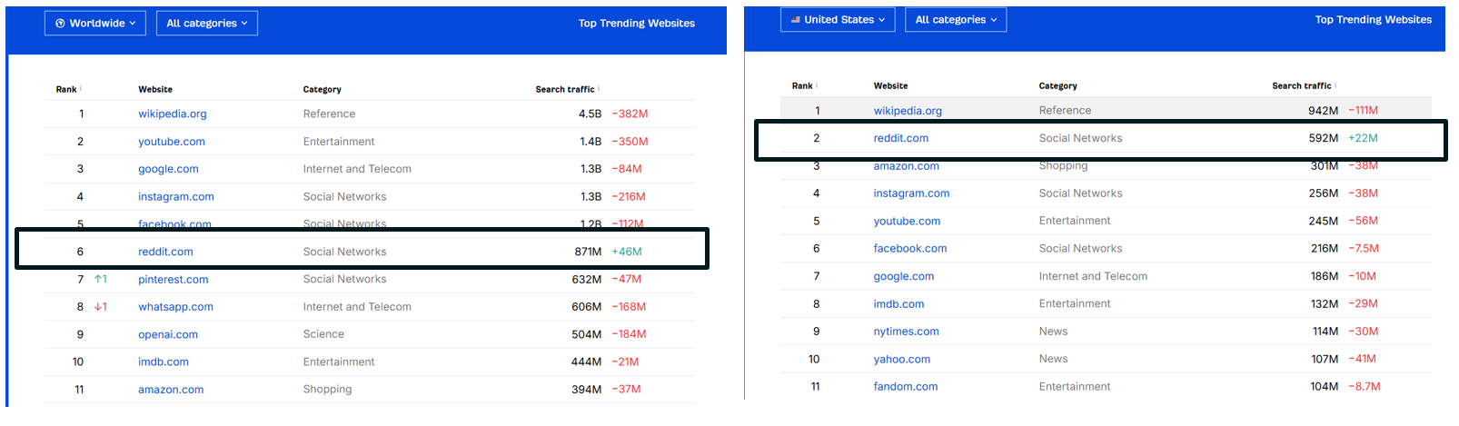 Google’s new AI Overviews routinely cites Reddit—Semrush ranks it the second-most-referenced site behind Wikipedia—so even when an overview answers the question in-line, the outbound link most likely to win a click is often a Reddit thread. That prominent placement creates incremental brand-impression loops that other sites, now shown lower on the page or folded into the overview itself, simply don’t capture.