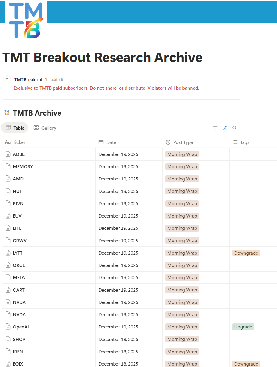For now: I have created a database that has archived all TMTB Morning and EOD wraps organized by ticker/topic/date. I know substack has incredibly limited search functionality and I’ve had a lot of requests to be able to search TMTB’s Archive in a fruitful manner.