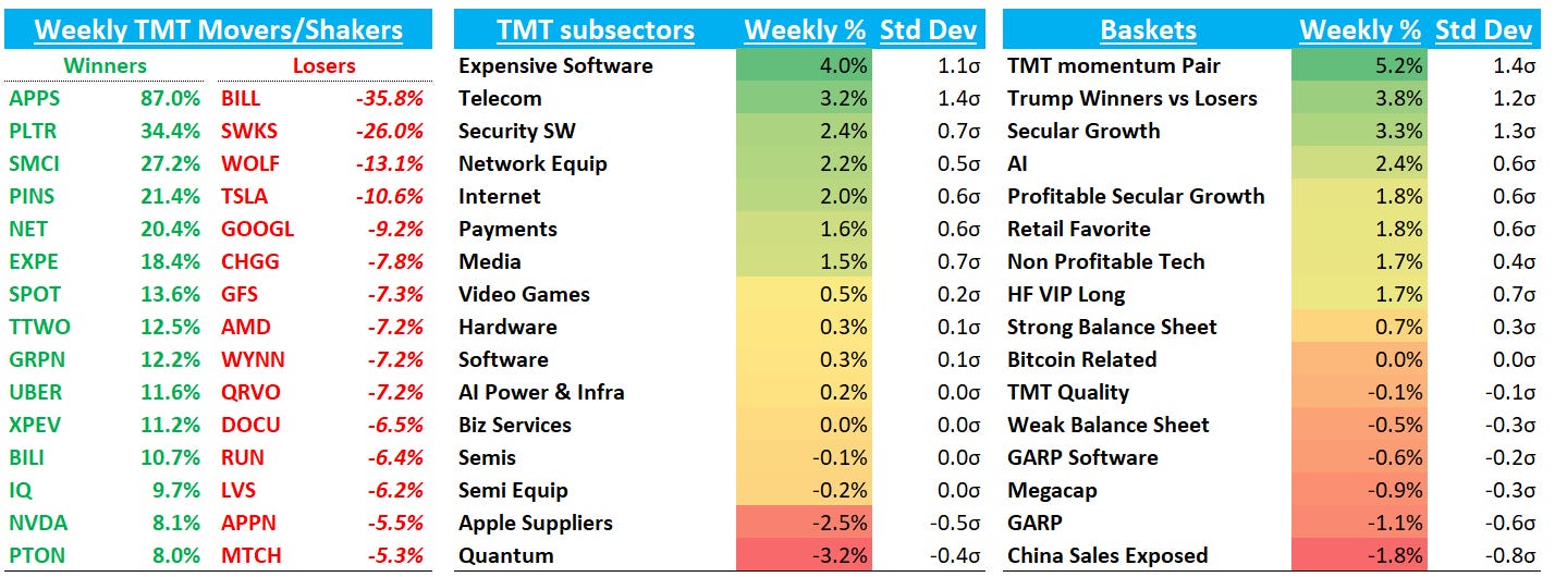 I won’t spend too much time on macro backdrop this week as not much changed. Overall, the environment continues to feel solid for stocks to us: subdued inflation, steady econ growth, fed easing cycle near the end but still intact, new biz friendly administration helping drive deregulation/increased biz confidence, oil close to $70, and an AI supercycle that is still intact. However, offsetting that we continue to have headline risks around tariffs/Trump proclamations, potential shutdown/debt ceiling, and uncertainty around DOGE and its impact,. We continue to think macro releases will have outsized impacts on the market — just look to Friday’s sell off following uptick in Michigan inflation expects. Next hurdle: CPI on Wednesday.