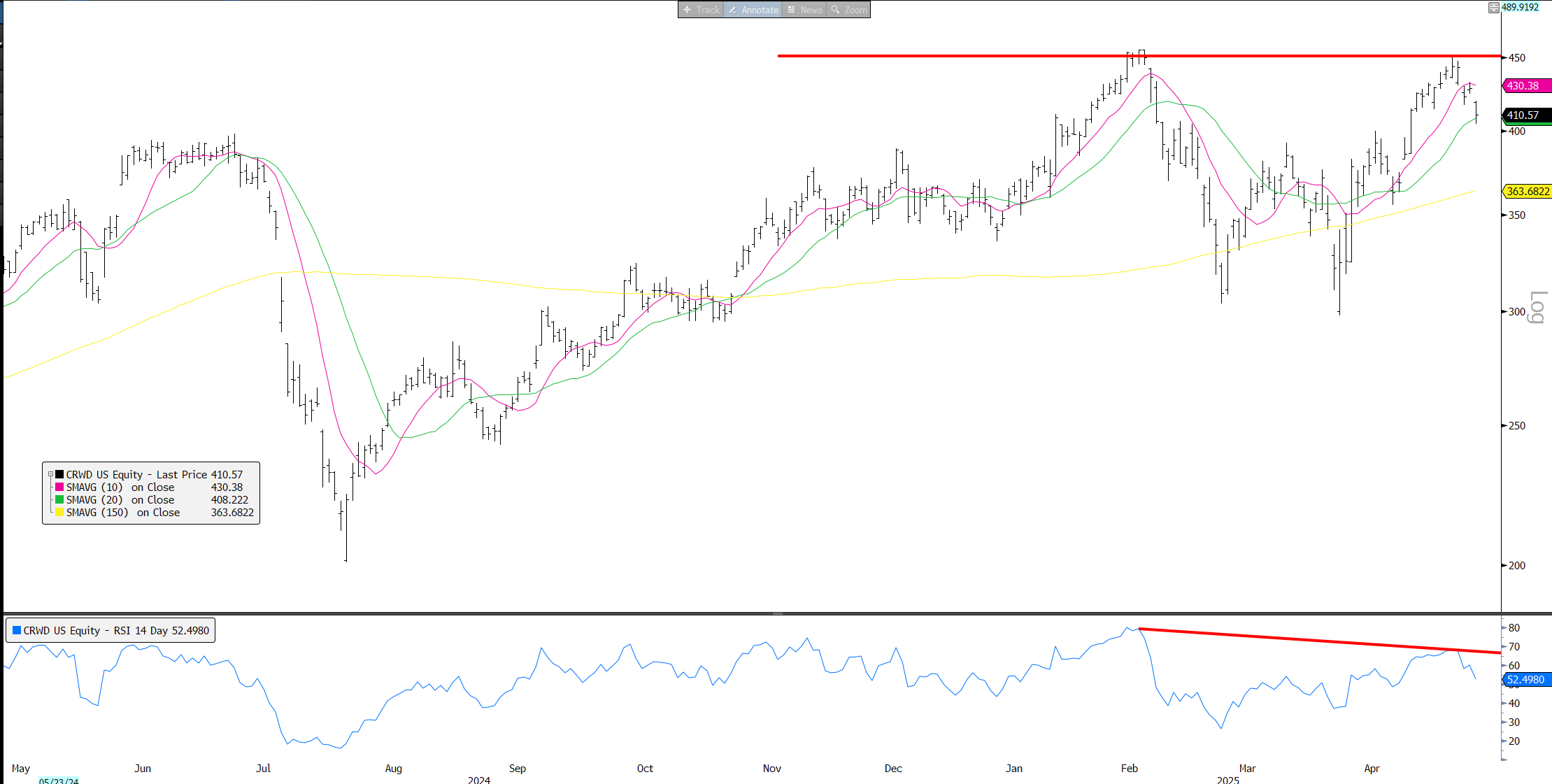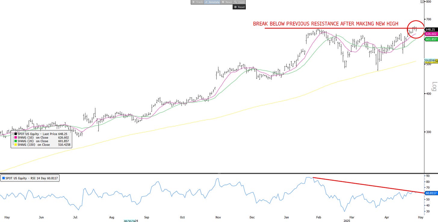 SPOT: Poster child #1 for recession resistant / tariff safe haven: Break below previous resistance after making new highs on neg RSI divergence