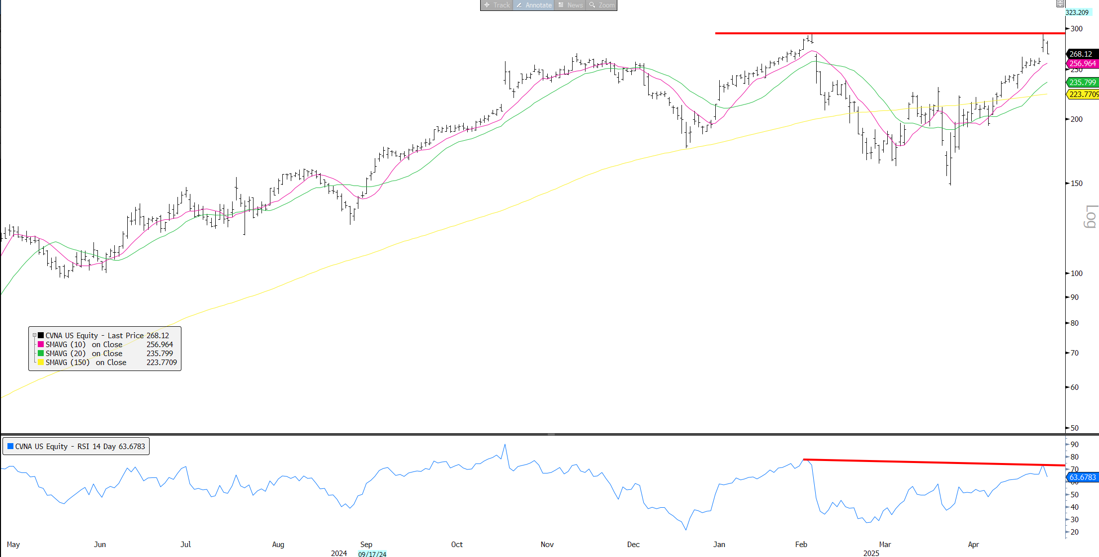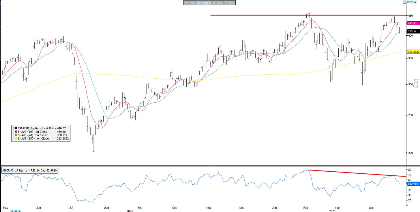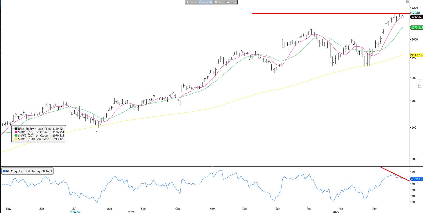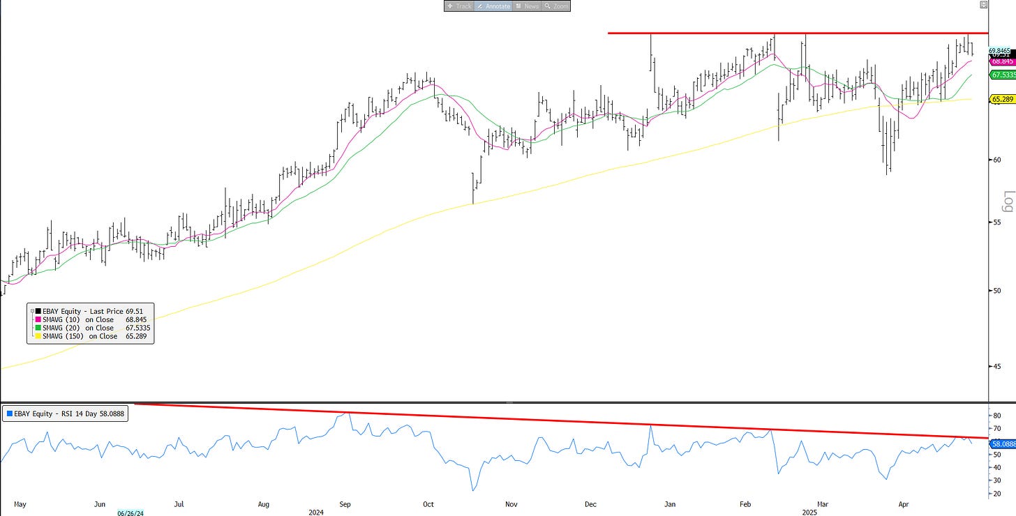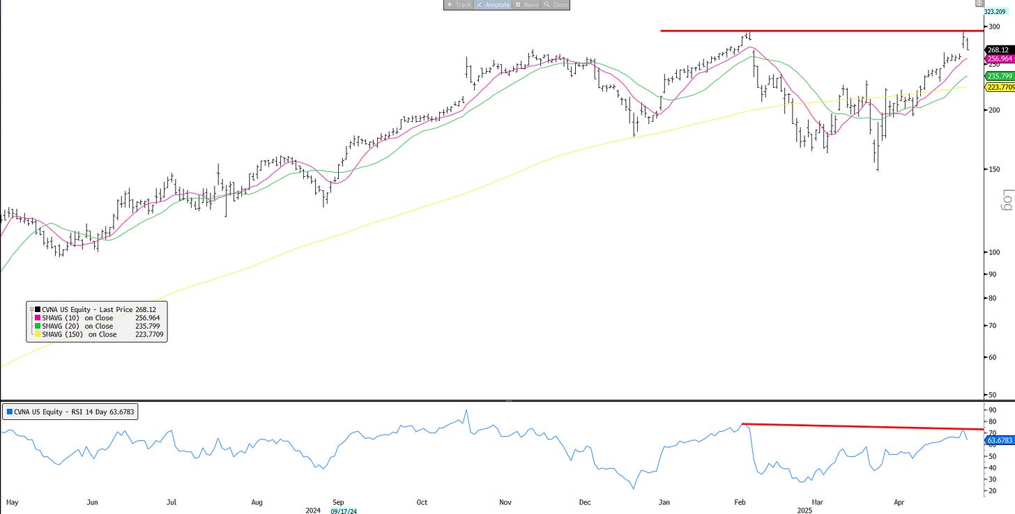 CVNA: Similar double top on neg RSI divergence. Couldn’t break out on better long-term guide. Down 6% on Friday.