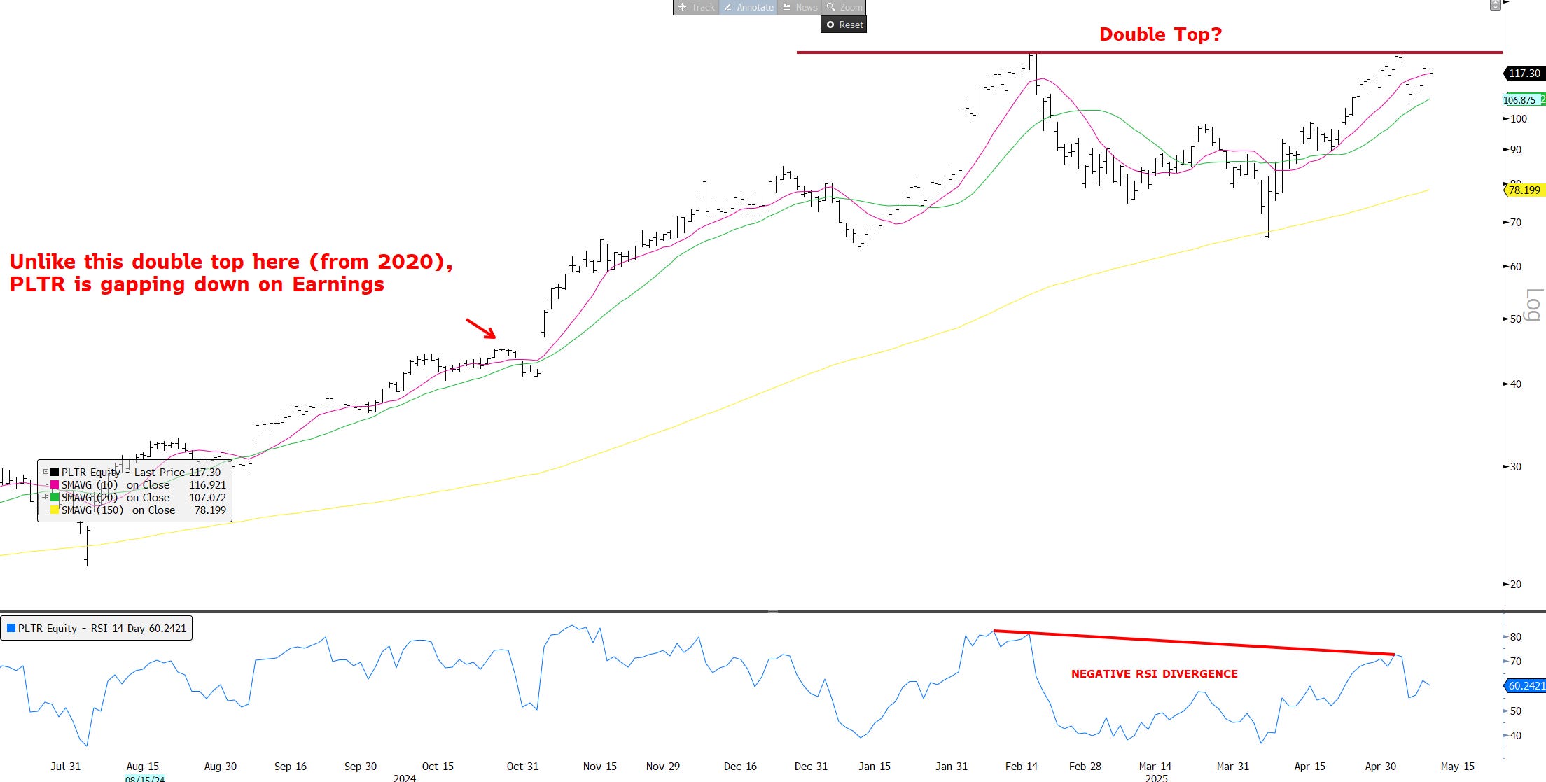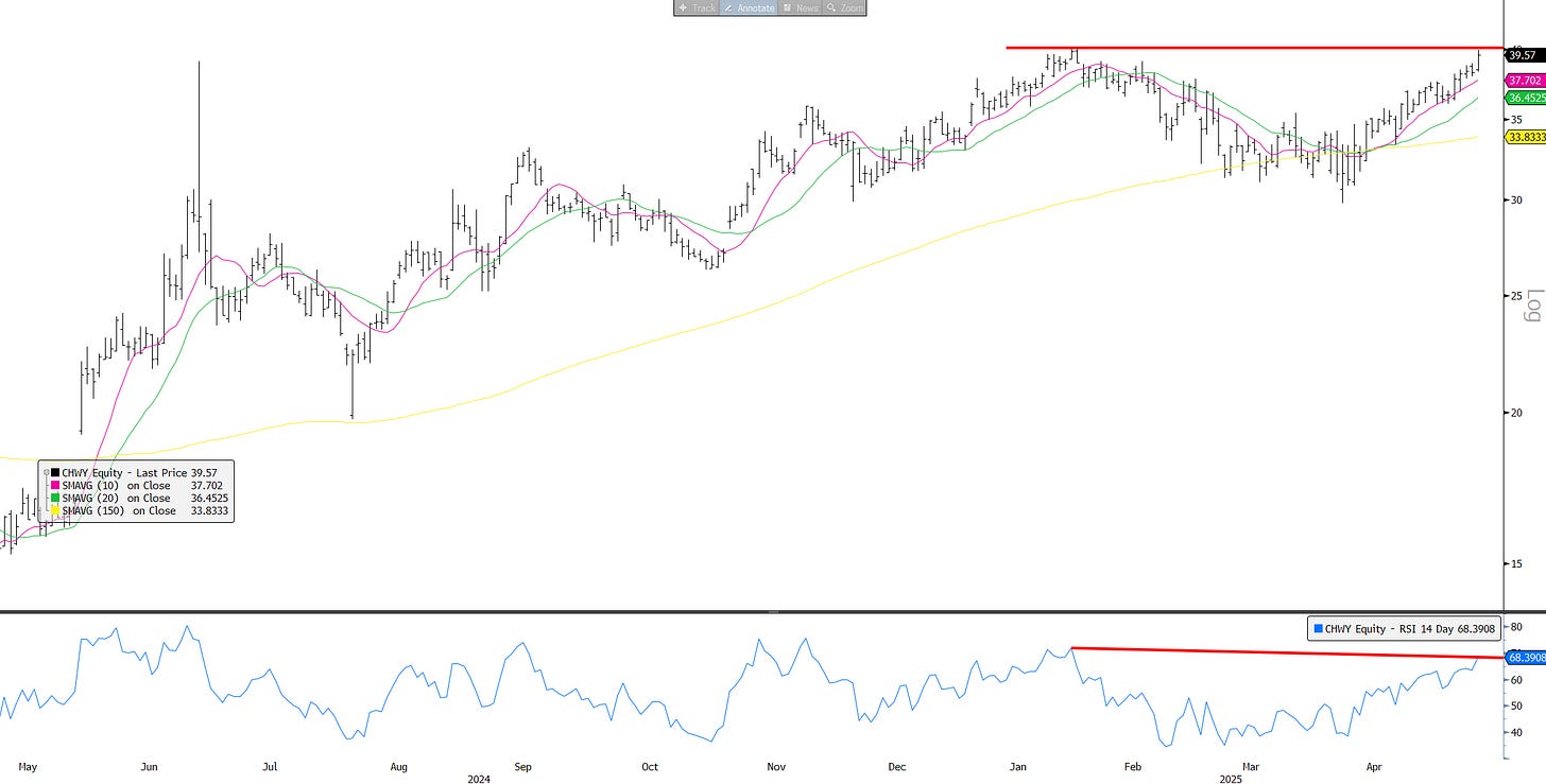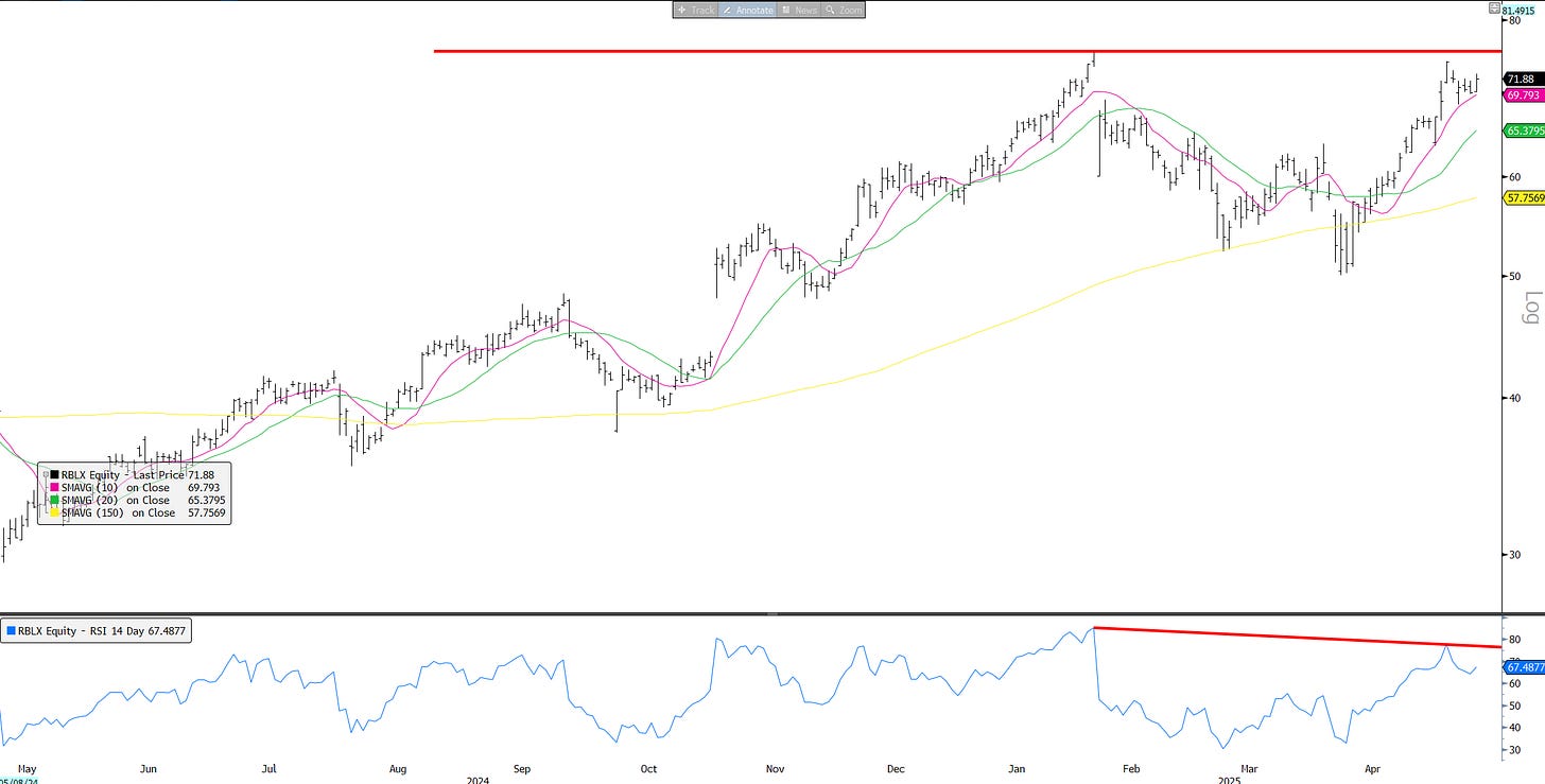 First, I am seeing a lot of tariff/China safe haven digesting strength — a lot of charts show something along the lines of a double top on negative RSI divergence: