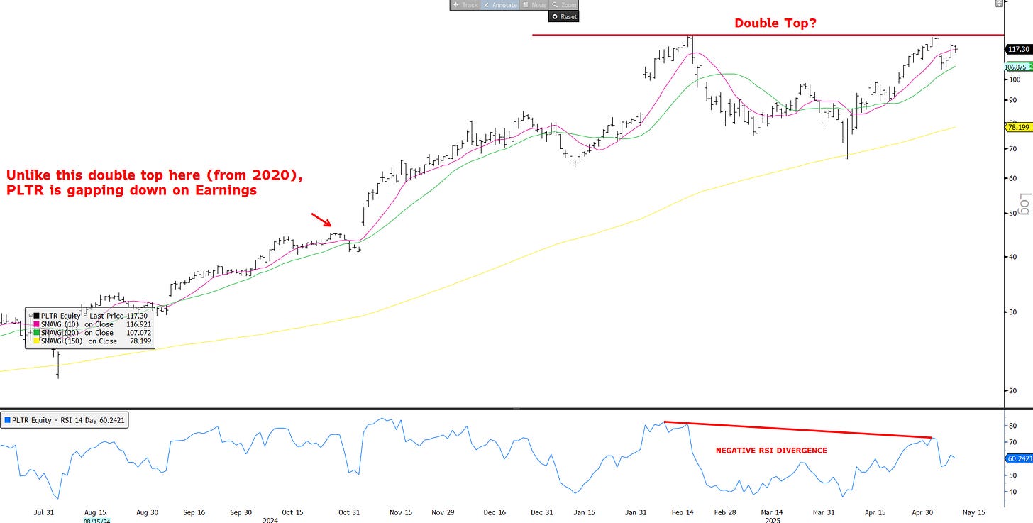 PLTR: One of strongest stocks up from the bottom (+80%) — double top and gapped down on strong earnings…One I have my eye on - if this makes new highs gives me confidence buyers in control. Looking for good long entry set up here to ride 10d/20d up…