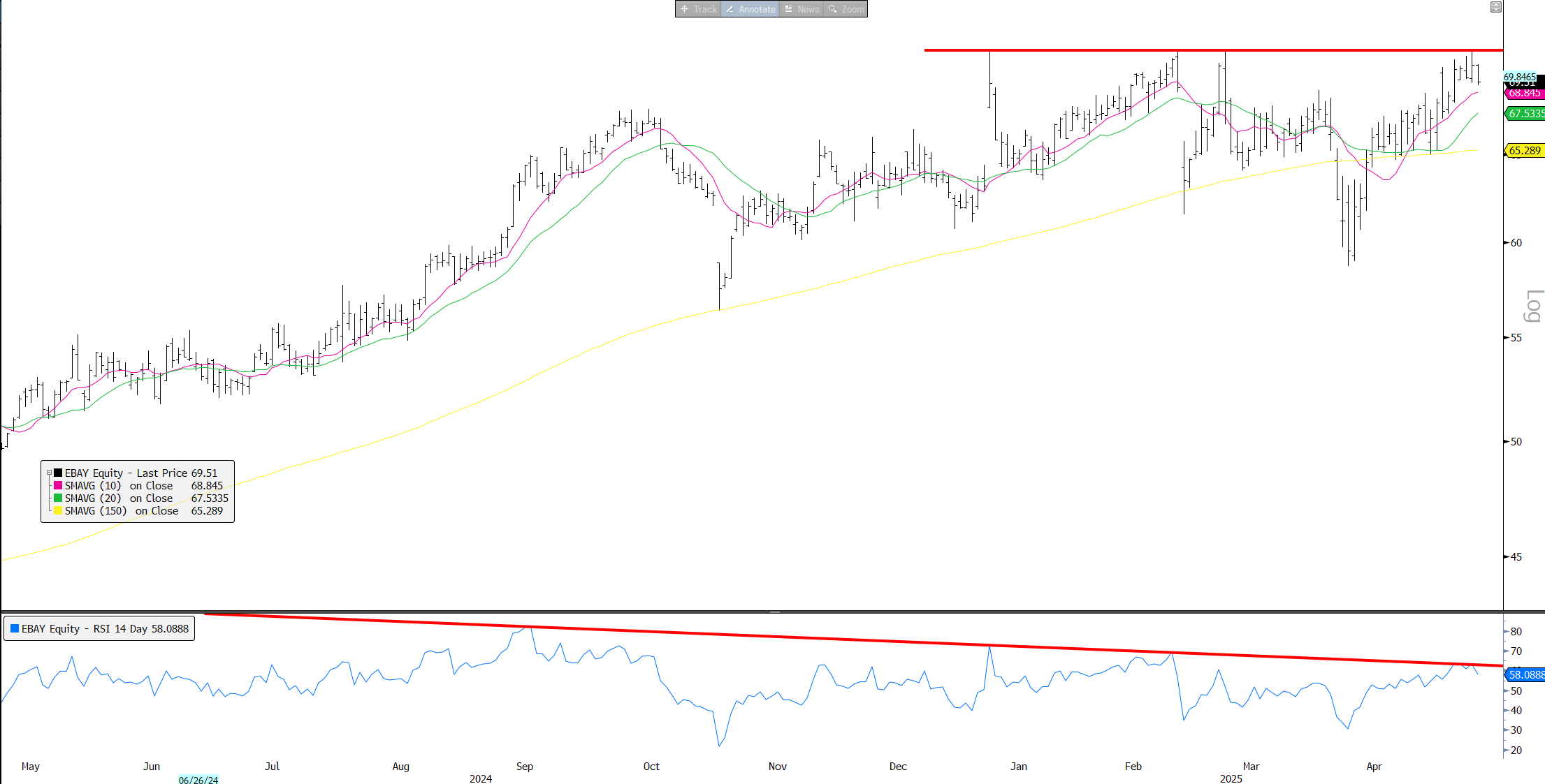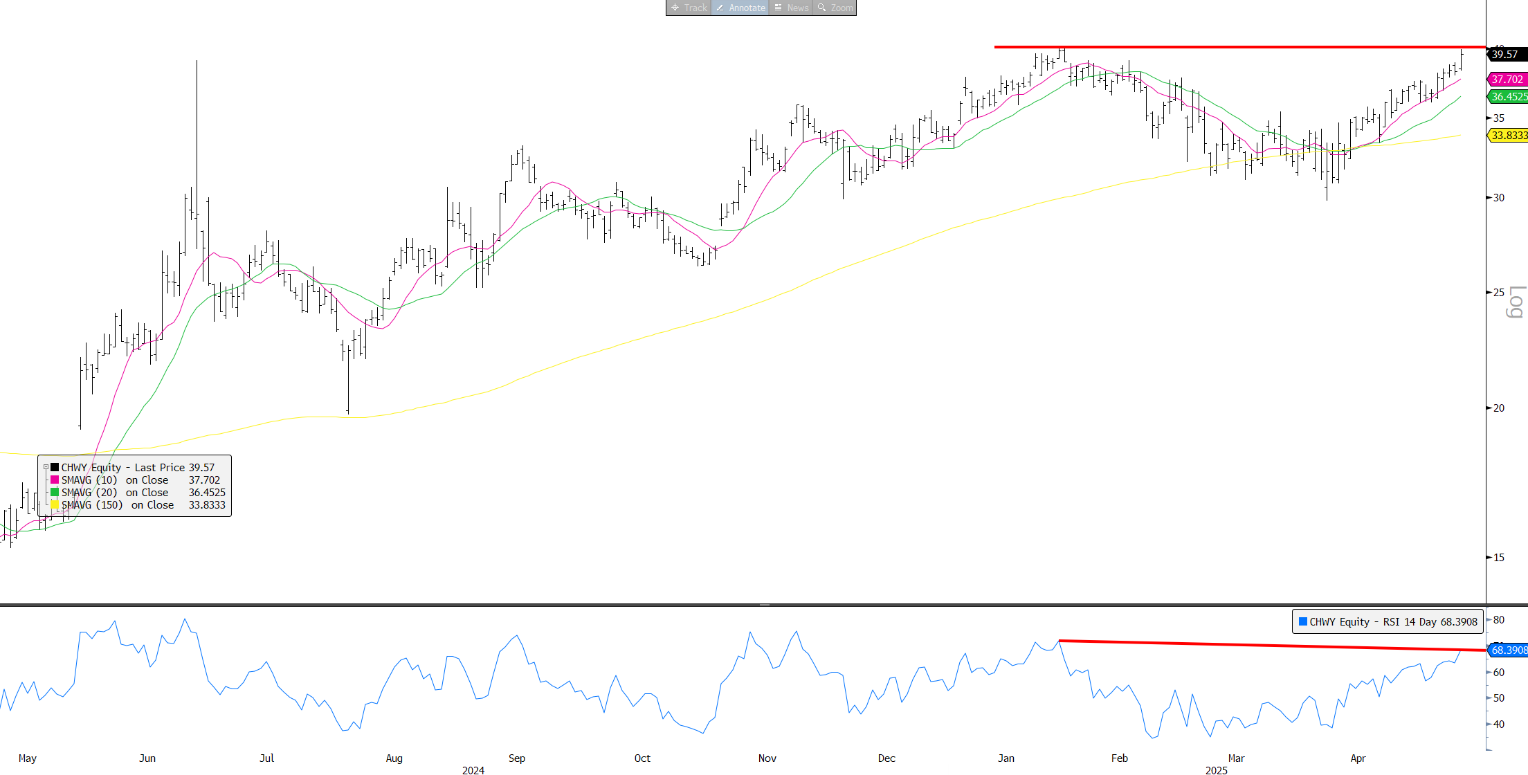 CHWY: Hitting resistance on neg RSI divergence. Strong chart as 3p remains strong.