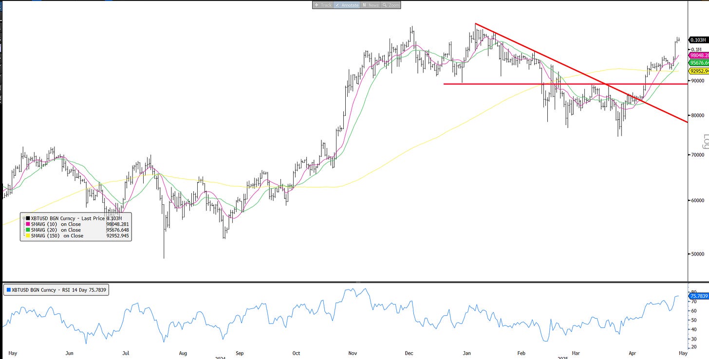 BTC: We’ve talked about positive price action dynamics here: in risk off → acts like digital gold and in risk on → acts like it has been acting recently breaking above $100k