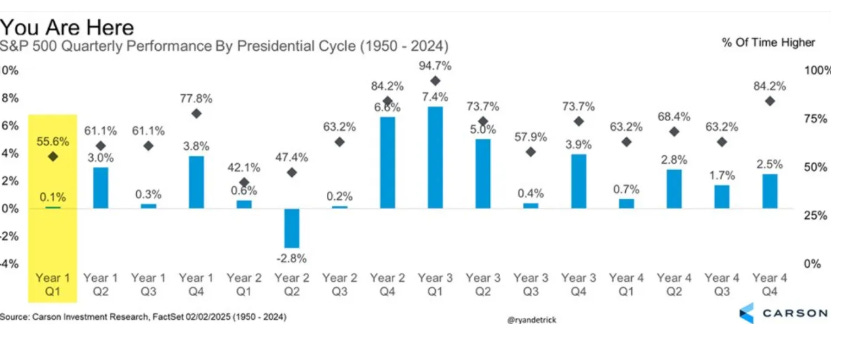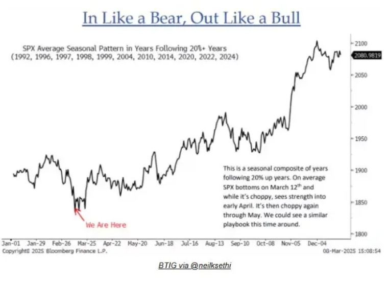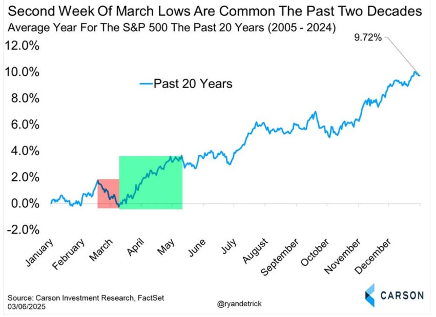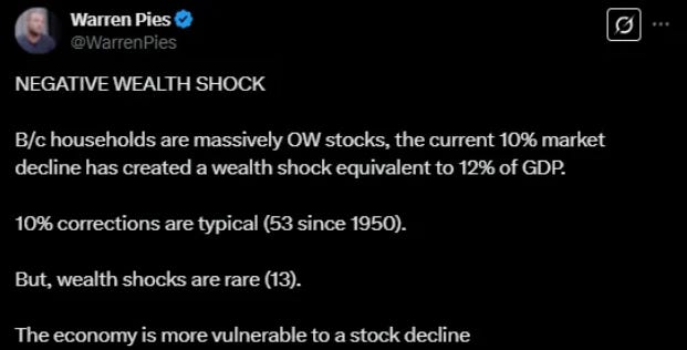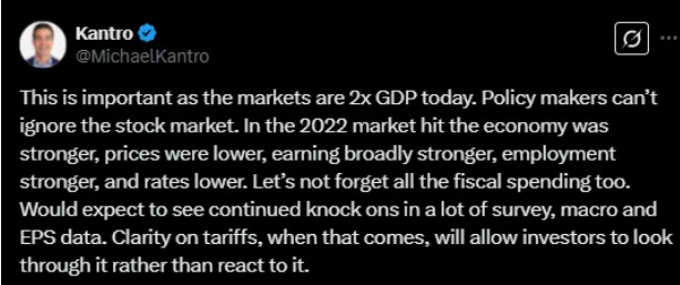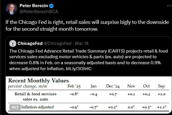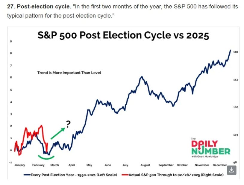 So a big jolt in early April (and potentially some sabre-rattling before then), but that would imply that news flow would get better (or less bad) after 4/2…still we’re pretty far away from the growth-positive policy changes (tax cuts, deregulation, less crowding out, etc.) that likely arrive in 2H of the year. So Trump/Bessent game plan seems to be —> hit economy now, try to thread needle by not causing too big a slowdown (although unclear to me if they actually might prefer a bigger slowdown/stock market pullback) , then take credit for big bounce back with “Trump” policies in 2H.