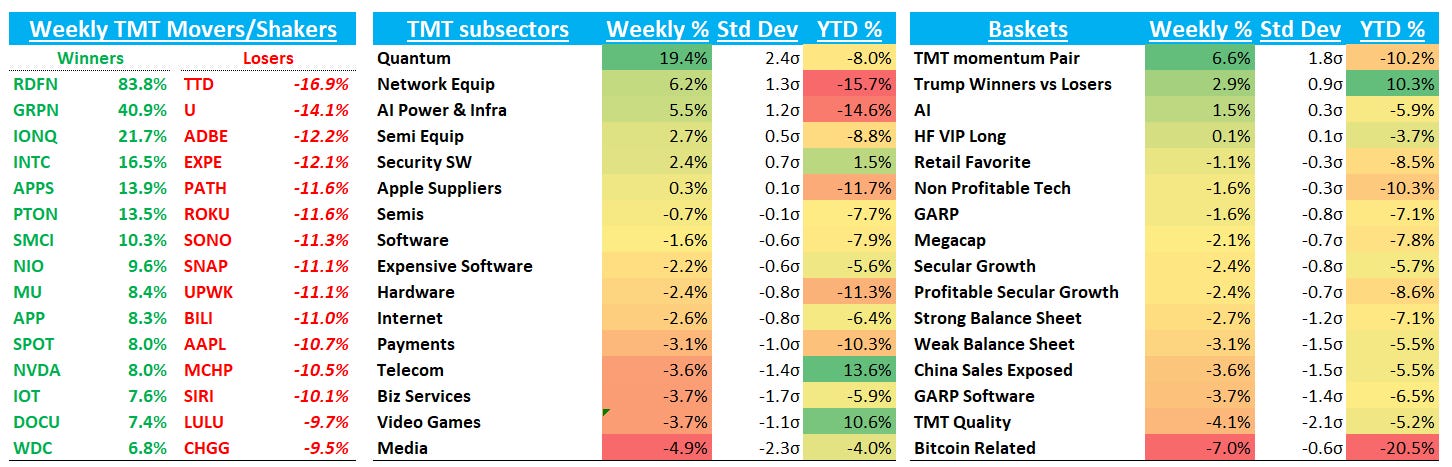 While the QQQs were down close to 3%, we began seeing early signs of positive tea leaves in the middle of week with many names not making new lows as the market did. Names like APP, MU, NVDA, and SPOT were up 8%+ on the week showing some real buying and a return to a focus on fundamentals and r/r prices. We’re even seeing some positive tea leaves in animal spirits as the Quantum basket was +20% heading into GTC’s quantum meeting with Jensen next week. Retail investors haven’t given up and as we get closer to tax day, retail headwinds begin to abate: