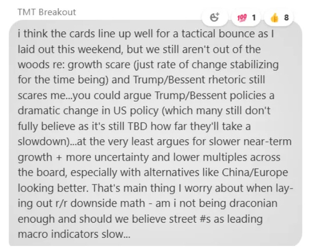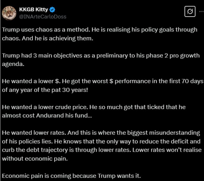 To us that tells us to be patient: last year was a great year and there is potential for 2H of the year to be a much easier environment. This all might make for a better trading/investing environment — its hard to remember, but the market was freaking out before Trump’s election + DOGE as the 10 year was close to 5% and dollar above $110.
