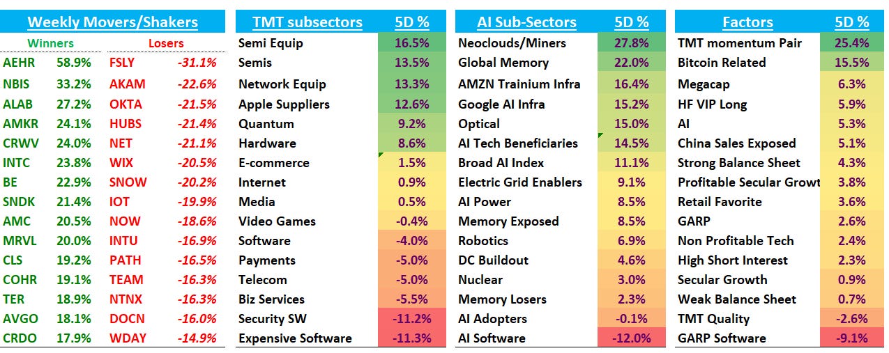 Happy Saturday. Well, that was quite a week, from an Iran Ceasefire to Anthropic throwing out a $30B ARR # alongside a major infra deal with GOOGL/AVGO, to more detail’s surrounding Anthropic’s Mythos, META finally catching up alongside other SOTA models with their Muse Spark release, to Jassy finally showing his pen is mightier than his dismal earnings call performances, and culminating with the worst 3 day stretch for software vs. semis ever while TMT Mo had its best week ever.