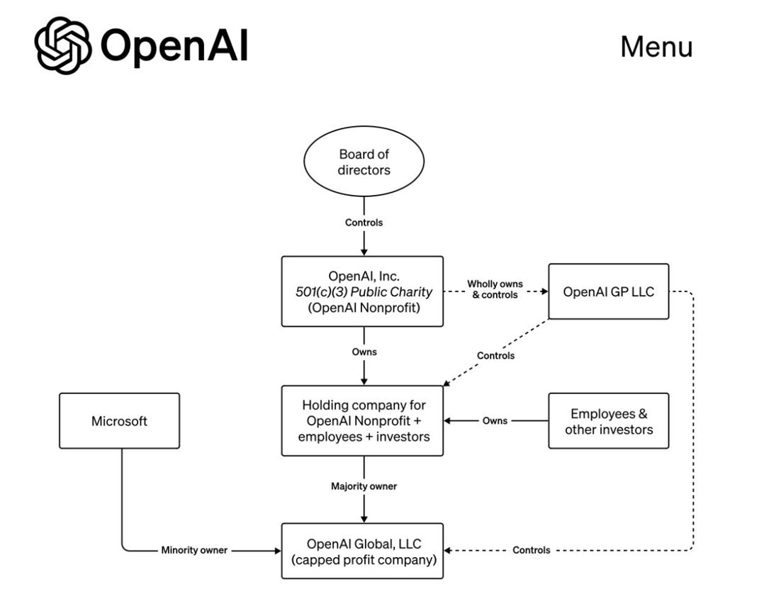 OpenAI’s control structure and mission is unique and interesting, with the BOD controlling the non-profit, which controls the for-profit arm (the one in which MSFT has an investment in):