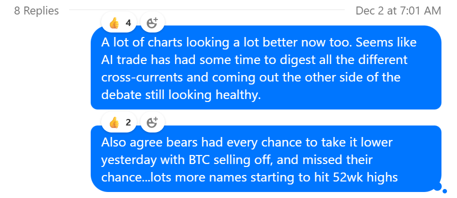 Market View: In our previous weekly two weeks ago, we talked about getting tactically long near the lows as we thought the r/r for Thanksgiving week was a good one, targeting $615+ on the QQQs. That worked out well, but we also said we weren’t ready to call an all-clear before the Fed meeting so we entered this week fully expecting some sort of digestion/pullback. That never came as QQQs finished the week up 1%+. We thought bears had a very good chance on Monday with the BTC sell-off and some mixed AI news flow, but the market began to show what direction it wanted to go. Here’s us on Tuesday morning in the chat:
