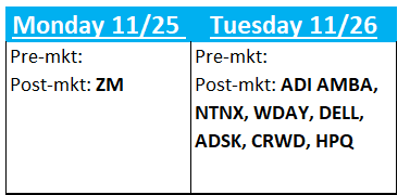 Happy Sunday. Oops, I mean Thursday night. I’m traveling most of the weekend so writing some thoughts out early this week as I watch BTC creep up on $100k. With a ho-hum NVDA print behind us, the focus shifts towards off-cycle software earnings, along with MU AVGO and MRVL in early December. If SNOW and ESTC were anything to go by, should be some fireworks. Quite a bit of names reporting for a shortened holiday week: