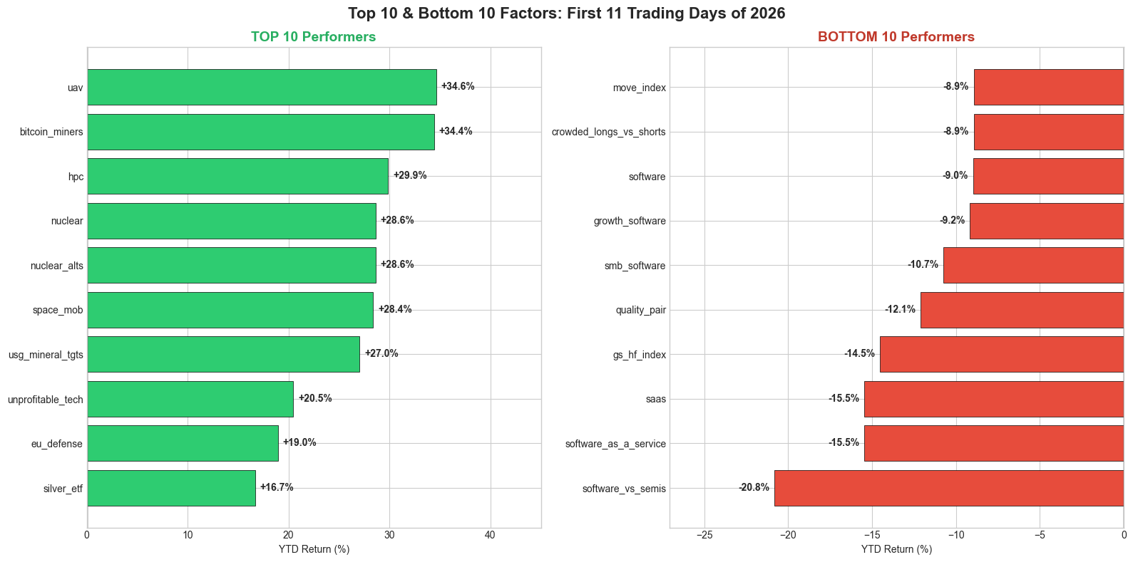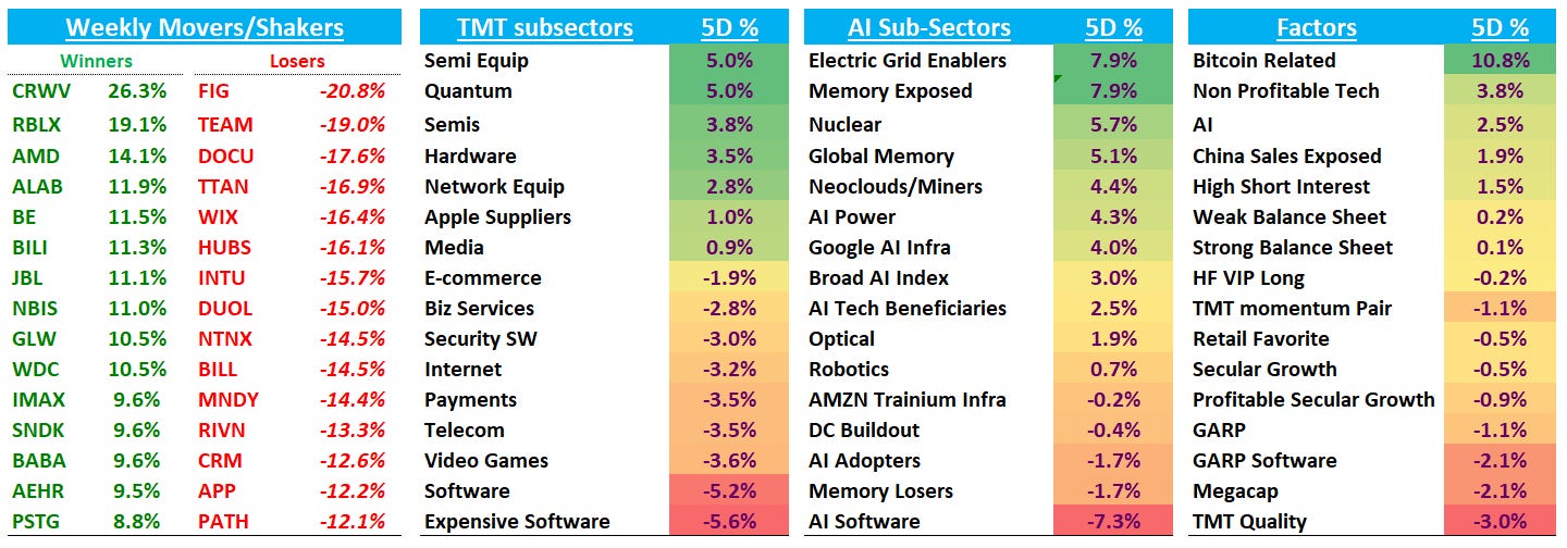 Happy Monday. Quite a start to the first two weeks of the year. The two big defining trades in Tech so far this year have been L IWMs vs S QQQs and L Compute/Memory vs. S Software. Outside of those it’s been a tricky environment as narratives outside of memory/storage feel unclear and unsteady. THE GS HF VIP vs. most shorted index is down 14% YTD, showing there is pain out there in the HF community despite extreme moves to the upside in some names (SNDK +75% / BE +70% YTD for example):