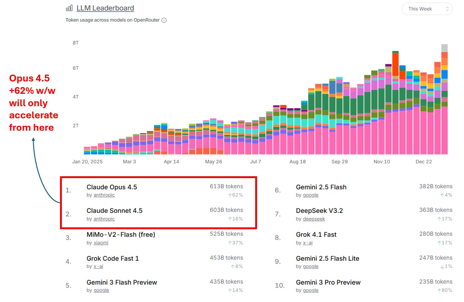 Opus 4.5 has already risen to the top of token usage at OpenRouter: