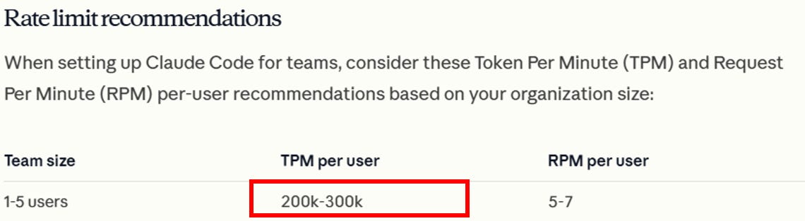 Anthropic’s own guidelines set recommending a limit of 200-300k Tokens per minute per 1-5 users. Yes, per minute.
