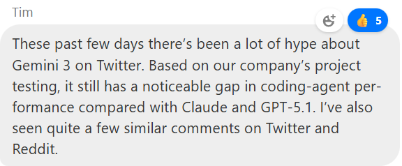 Reading reviews on X and Reddit, many still prefer Codex and Sonnet 4.5 to Gemini 3 Pro, which still has low rate limits:
