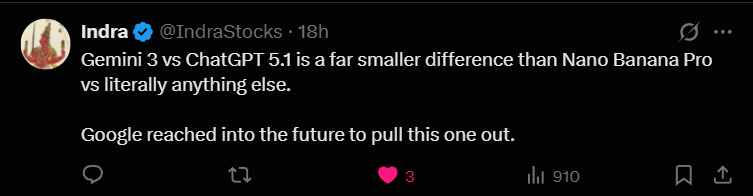 Last week, we wrote how we were undergoing a new paradigm shift in the AI trade after Sam’s Splurge, with increasing questions and scrutiny versus the first 3 years of the trade where most AI infra stocks acted as a monolithic block. If Sam Altman’s spending binge opened up the pandora’s box of existential AI questions, the Gemini 3 release this week delivered an even bigger shock to the equation, further reinforcing our view that the AI trade has shifted into a fundamentally different regime.
